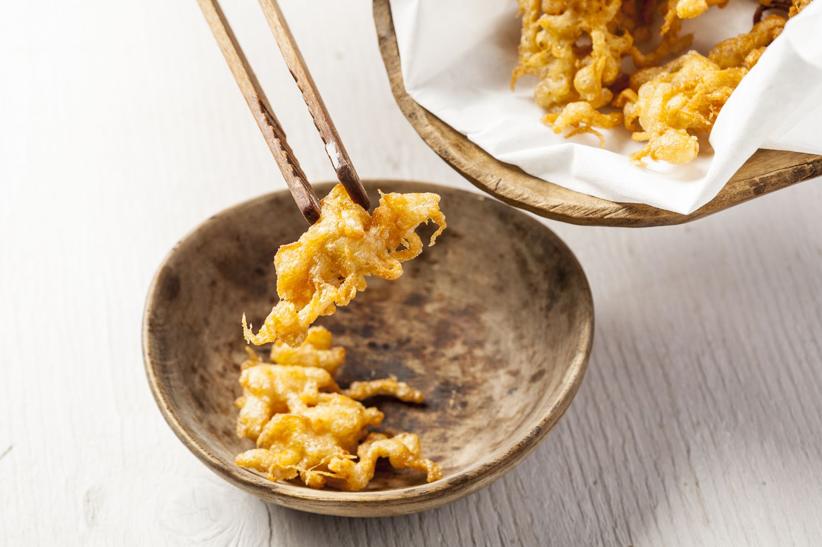 Una volta pronti, versate con una pinza i Saikebon in piccole quantità nella pastella.
